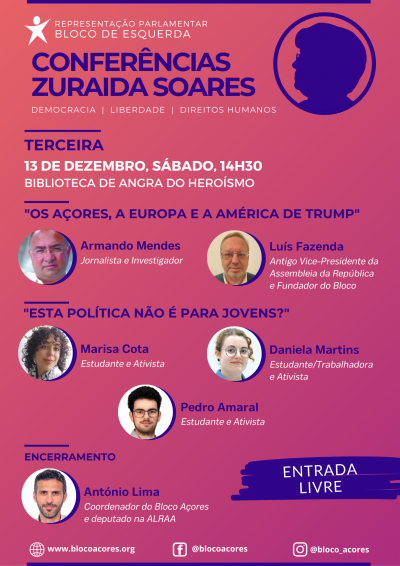 A quarta edição das “Conferências Zuraida Soares”, que se realiza no próximo sábado, na ilha Terceira, junta Armando Mendes e Luís Fazenda para debater o papel dos Açores no atual contexto político internacional, e conta também com três ativistas açorianos para um debate sobre a participação dos jovens na política: Daniela Martins, Marisa Cota e Pedro Amaral.