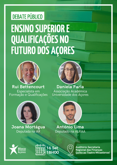 O Bloco de Esquerda vai realizar um debate público com o tema “Ensino Superior e Qualificações no Futuro dos Açores”, no próximo sábado, dia 16 de setembro, às 18h00, no auditório da Secretaria Regional das Finanças, em Ponta Delgada. Rui Bettencourt, Joana Mortágua, Daniela Faria e António Lima serão os oradores.