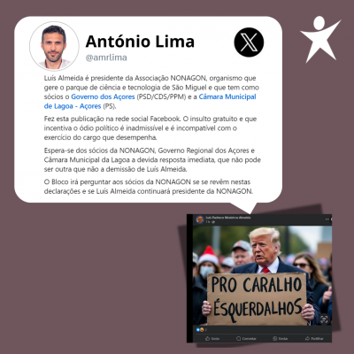O Bloco de Esquerda denuncia a disseminação de uma mensagem antidemocrática e de incentivo ao ódio na rede social Facebook pelo presidente do conselho de administração do Nonagon e quer saber se o Governo Regional e a Câmara Municipal de Lagoa – sócios fundadores da associação – mantêm a confiança em Luís Pacheco Medeiros Almeida para ocupar aquele cargo.