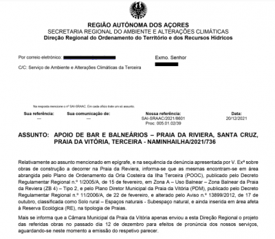 5 – Esta resposta, assinada pelo diretor regional do Ordenamento do Território e dos Recursos Hídricos, datada de 20 de dezembro de 2021, diz claramente que a Praia da Riviera está classificada como ‘Tipo 2’. No documento lê-se que as obras “encontram-se em área abrangida pelo Plano de Ordenamento da Orla Costeira da Ilha Terceira (POOC), publicado pelo Decreto Regulamentar Regional n.º1/2005/A, de 15 de fevereiro, em Zona A – Uso Balnear – Zona Balnear da Praia da Riviera (ZB 4) – Tipo 2”.